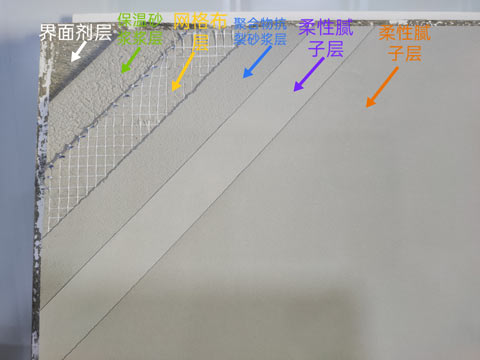 5、待聚合物砂浆干后(批刮24小时),进行柔性腻子批刮,要求批刮平整厚度在0.2mm左右,腻子干后进行第二遍批刮。晾干后撕下美纹纸即可看到分层效果。