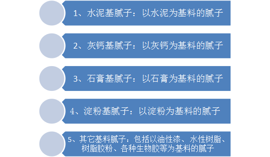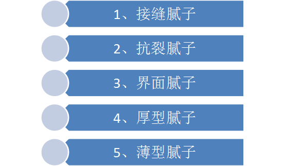 建筑室内用腻子:一般型腻子(Y)、耐水型腻子(N型)、柔韧型腻子(R型)。
