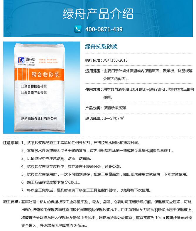 抗裂砂浆由聚合物和水泥和砂按一定比例加水搅拌制成的能满足一定变形而保持不开裂的砂浆,抗裂砂浆是一种新型的抗龟裂材料。抗裂砂浆应用于保温层抹面的处理或者应用于内外墙加气块,剪力墙的薄抹灰找平材料的使用。