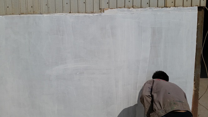3、喷涂封闭底漆:将干燥后的腻子找平层进行打磨,保证墙面平整度及线条平整清晰,扫除浮灰后喷涂或滚涂封闭底漆。