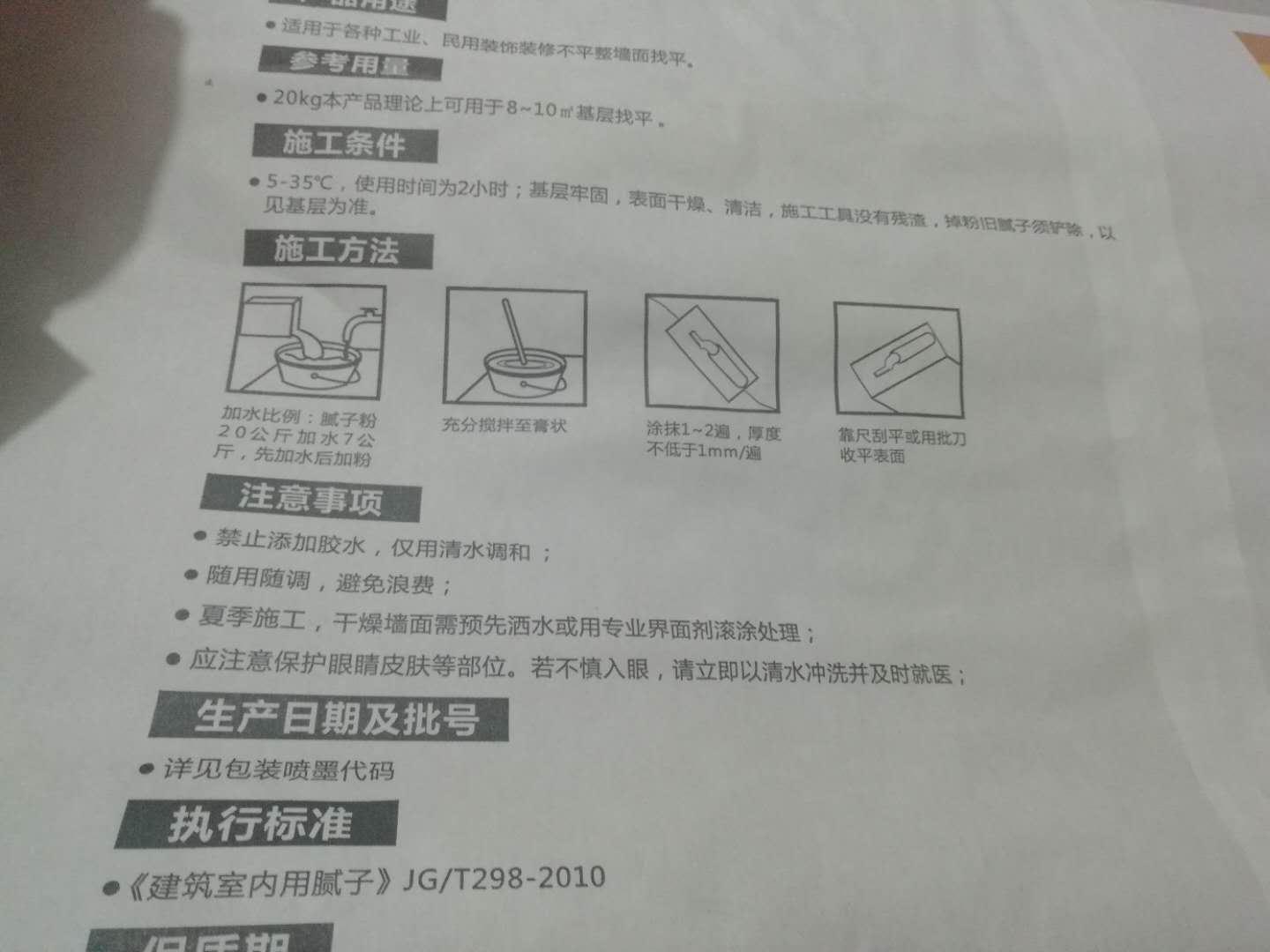 3.使用方法:将腻子粉加水搅拌10分钟成膏状腻子静置,5分钟后即可批刮上墙,一般刮两遍,第二遍刮得时候要等第一遍墙面干了才能刮。干燥后应及时用砂纸打磨(24-48小时内),整平后清除整个墙面灰尘,稍干即可施涂乳胶漆。