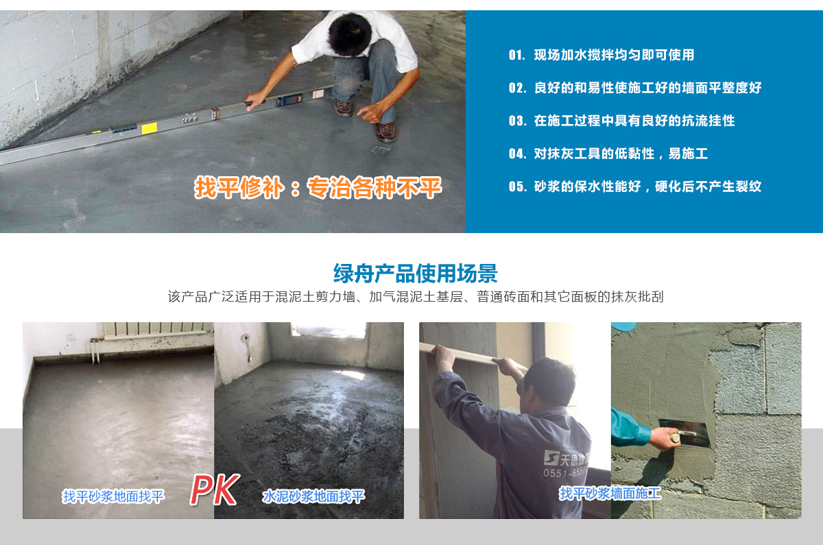 产品特点:使用方便,现场加水搅拌均匀即可使用。良好的和易性使施工好的墙面平整度好。在施工过程中具有良好的抗流挂性,对抹灰工具的低黏性,易施工。砂浆的保水性能好,硬化后不产生裂纹