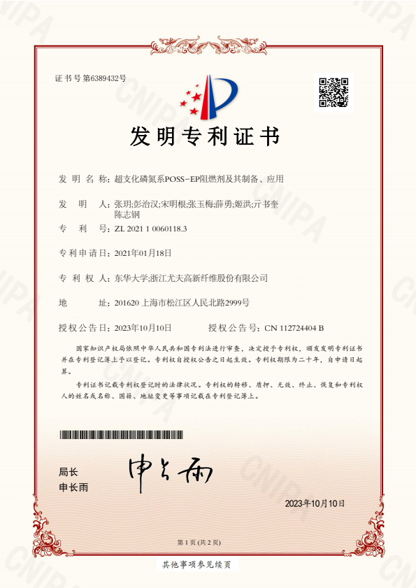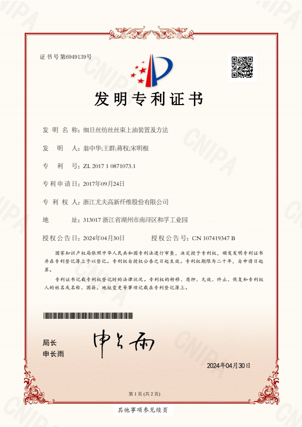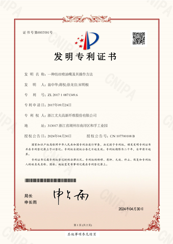 发明专利证书一种纺丝喷油嘴及其操作方法