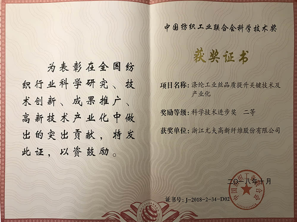 中国纺织工业联合会科学技术奖二等奖2018.10