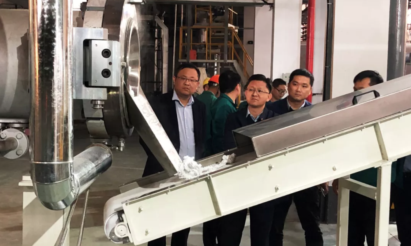 2019年11月21日,尤夫股份联席总裁翁中华、化纤总经理王尤辉在销售总监李敬之的陪同下,深入天花膜事业部,调研指导试机工作。